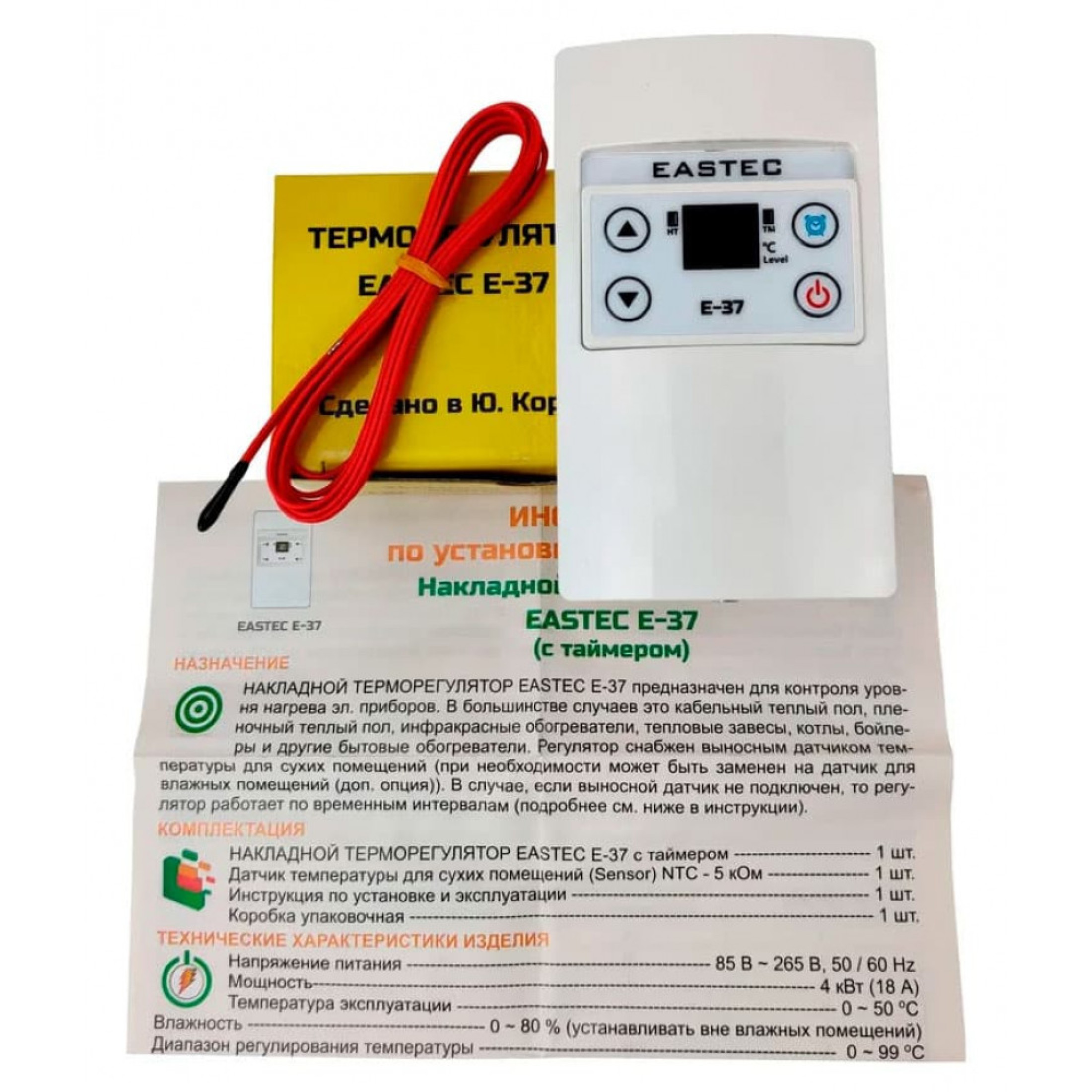 Накладной терморегулятор EASTEC E-37 - предназначен для контроля уровня нагрева эл. приборов, таких как кабельный теплый пол, тепловые завесы, котлы, бойлеры и др. бытовые обогреватели Цифровая индикация температуры, кнопочное управление. Максимальная мощность 4кВт Сверхудобное ПЕРЕДНЕЕ подключение (электрические колодки расположены в передней части регулятора за защитной крышкой) Таймер отключения (от 1 до 12 часов) время, через которое термостат выключится В случае, если выносной датчик не подключен, то регулятор работает по временным интервалам (от 1 до 10 (1- 60) мин). Терморегулятор Eastec E-37 имеет защиту от перепадов напряжения сети 85-265 В, 50/60 Гц благодаря чему весьма актуален в частном жилом секторе. Также Е-37 оснащен защитой от сброса значений температуры при отключении питания. (При повторном включении автоматически выставляется последняя выставленная температура.)